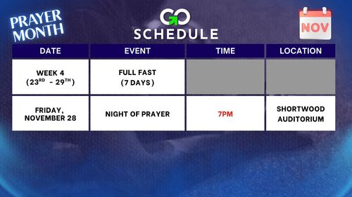 Join us as we conclude Prayer Month with a powerful Night of Prayer — an evening set apart to worship, intercede, and seek God together as a church family. Come expecting breakthrough, restoration, and a fresh outpouring as we lift our voices in unified prayer.